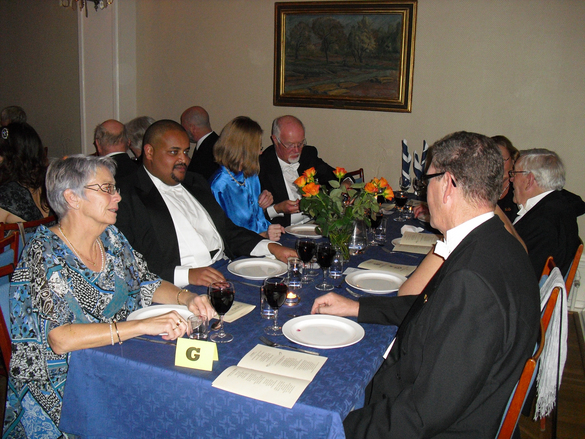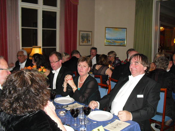 Lørdag kveld klokken 18:00 var vi pyntet og klar for avgang til logehuset og Mårtensgås. Som vanlig ventet det oss en varm velkomst. Og etter vordrink og mingling var vi klar til å gå til bords. Vi var til sammen 114 gjester som gledet oss til kveldens måltid og underholdning. Ikke alle spiser SvartSoppa, men personlig syntes jeg den var meget bra i år. Alternativet for ”pinglene” er Asparges-suppe. Så var det gås med tilbehør og til slutt is. Underholdningen sto Camilla Rinquist og hennes sønn Elias (på piano) for. Hun sang Piaf, Brel, Barbara og egne franske sanger.