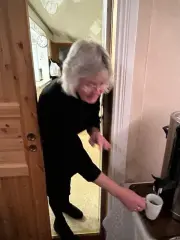 Etter mat fikk vi servert kaffe og kake i salongen med noe i det lille glass for de søm ønsket dette.