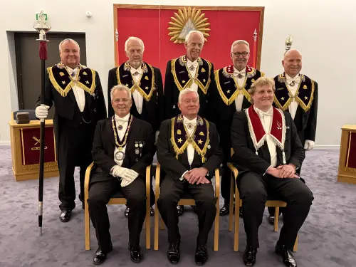 På bildet sitter Veteranen foran i midten, med logens Overmester på sin venstre side. |