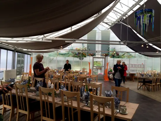 Et stort drivhus var delt i to, vi fikk omvisning i den ene delen som nå er en frodig urtehage, hvor avlingen brukes mye i maten som lages og serveres på gården. I den andre ½ part av drivhuset var det innredet til et spesielt og stemningsfullt selskapslokale hvor det var fint dekket for en 3 retters middag til oss.