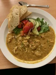 Vi fikk servert kyllinggryte med salat og foccacia. Is med chrønsj etterpå.